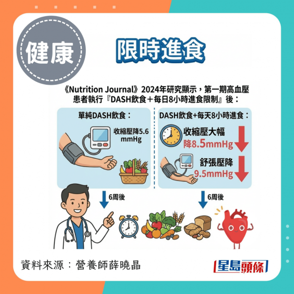 《Nutrition Journal》2024年研究顯示,第一期高血壓患者執行「DASH飲食+每日8小時進食限制」後: