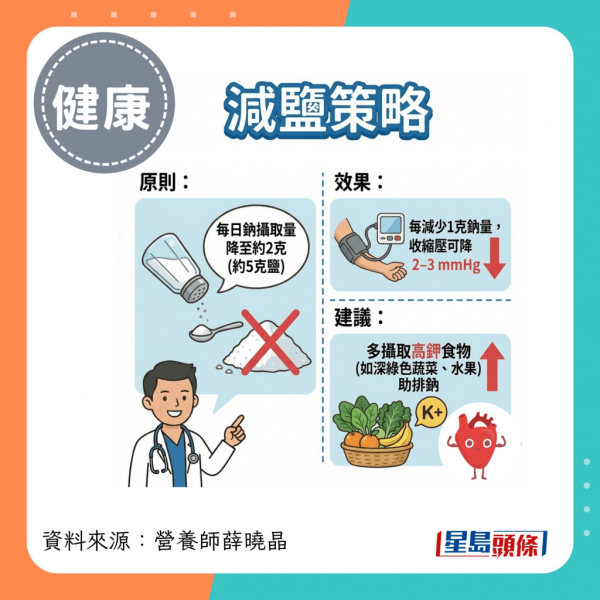 - 效果:每減少1克鈉量,收縮壓可降 2–3 mmHg。建議多攝取高鉀食物(如深綠色蔬菜、水果)助排鈉。