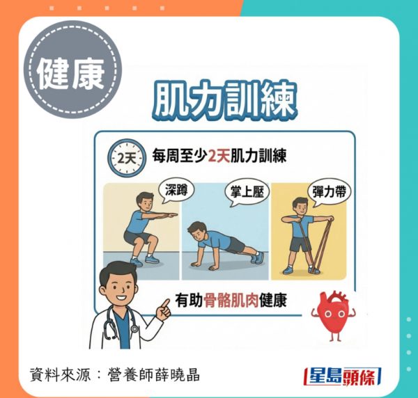 - 肌力訓練:每周至少2天(深蹲、掌上壓、彈力帶)