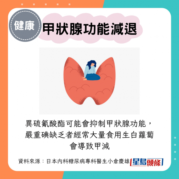 芥子酶產生的異硫氰酸酯,可能會抑制甲狀腺功能。因此,嚴重碘缺乏者經常大量食用生白蘿蔔會導致甲減。不過,加熱會降低芥子酶的含量並使其失去活性,因此將白蘿蔔烹調食用,並從海帶、昆布中攝取足夠的碘就可以減少影響。甲狀腺疾病患者食用白蘿蔔前最好先諮詢醫生。
