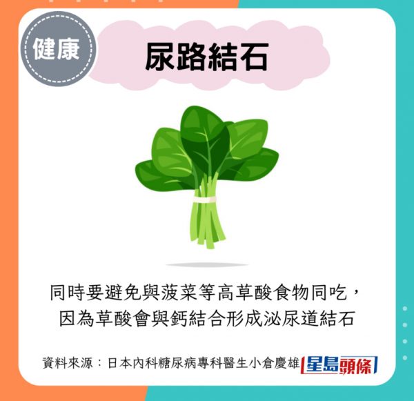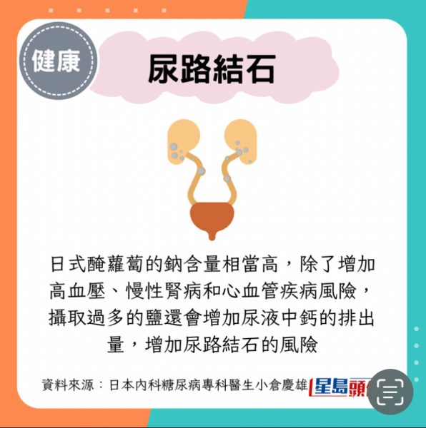 日式醃蘿蔔的鈉含量相當高,每100g約含2.5g鈉。攝取過多的鹽除了大增高血壓、慢性腎病和心血管疾病風險,還會增加尿液中鈣的排出量,令尿路結石的風險上升。同時還要避免與菠菜等高草酸食物同吃,因為草酸會與鈣結合形成泌尿道結石。最好選擇「無鹽」罐裝或冷凍醃蘿蔔以減少鹽的攝取。