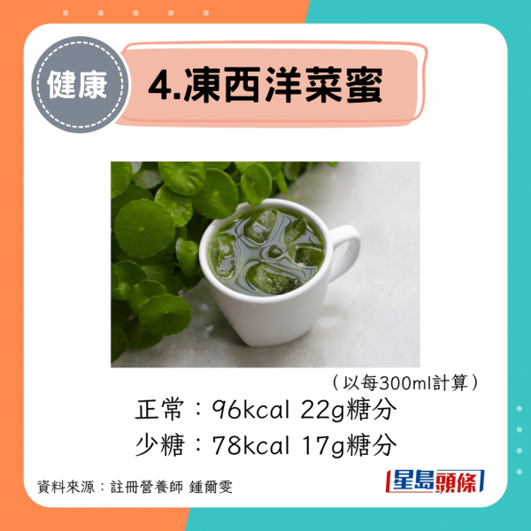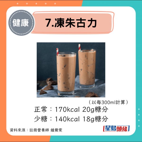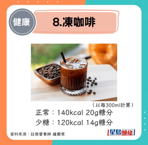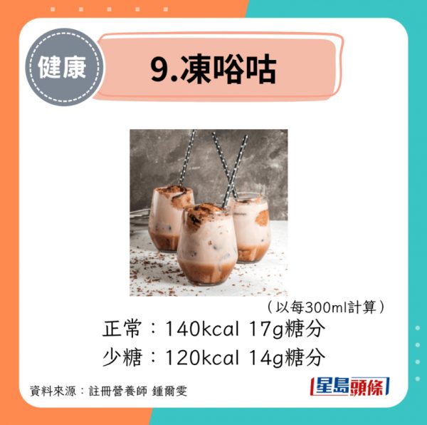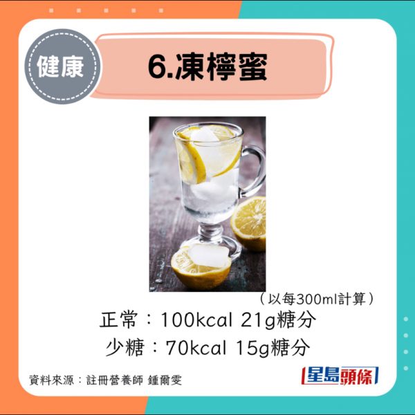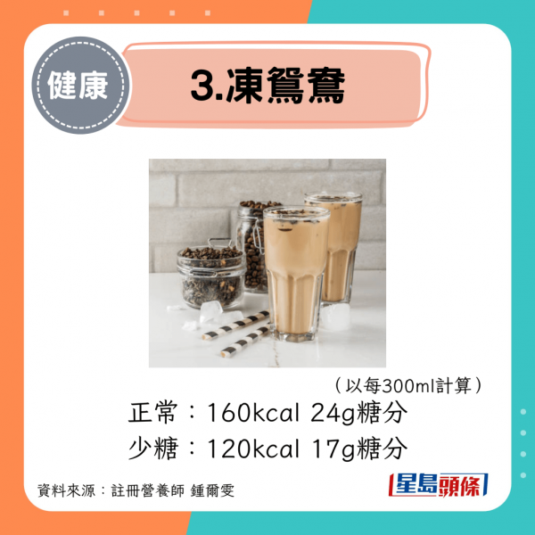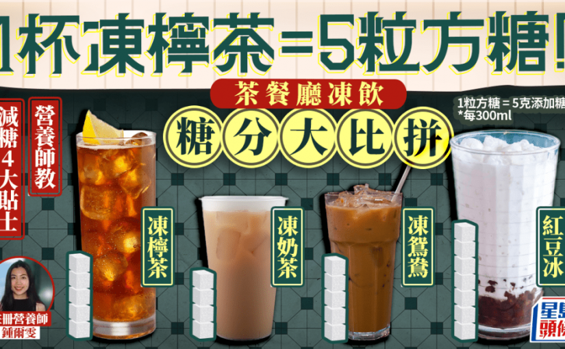 註冊營養師鍾爾雯在Instagram發文指,平時到茶餐廳用餐時,幾乎每人都會點一杯飲品,但一杯茶餐廳凍飲的糖分很可能已超出整餐的建議攝取量,即使飲品選擇少糖或少甜,其糖分依然不低;即使是少糖版本,其糖分含量可能仍相當於約3顆方糖。她特別整理9款茶餐廳常見凍飲的糖分含量,供茶餐廳愛好者參考。