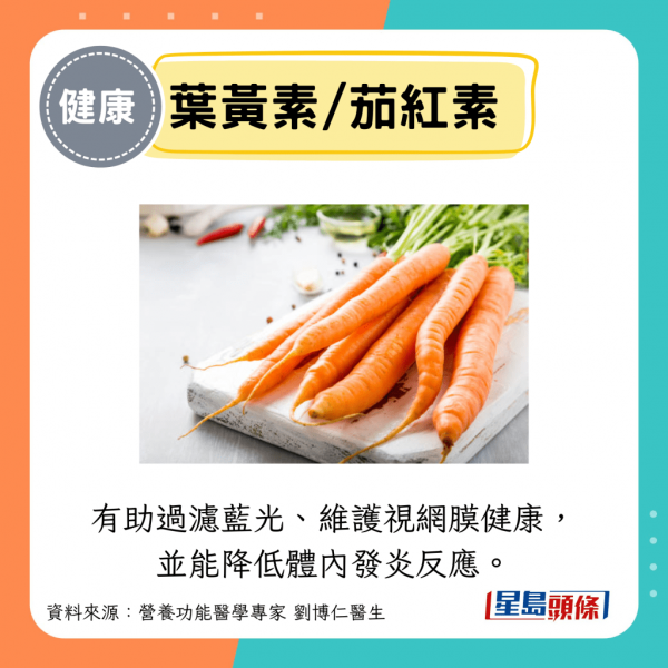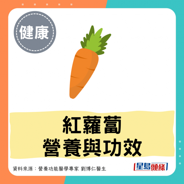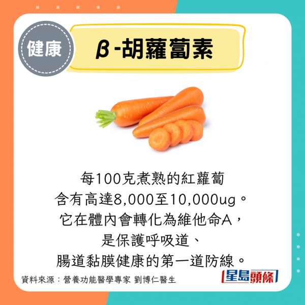 • β-胡蘿蔔素:每100克煮熟的紅蘿蔔含有高達8,000至10,000ug。它在體內會轉化為維他命A,是保護呼吸道、腸道黏膜健康的第一道防線。