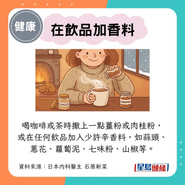 喝咖啡或茶的時候,撒上一點薑粉或肉桂粉,也可以任何在飲品加入少許辛香料,如蒜頭、蔥花、蘿蔔泥、七味粉、山椒等。