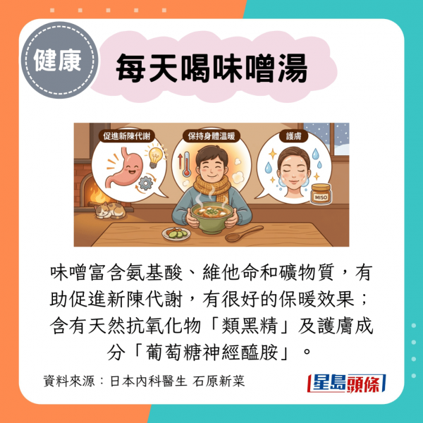 味噌是被認為「超級食物」,它是一種發酵食物,富含氨基酸、維他命和礦物質,有助促進新陳代謝和維持健康的腸道環境,對於保持身體溫暖有很好的效果;當中的天然棕色色素「類黑精」,是一種強大的抗氧化物,能夠預防疾病。味噌還含有護膚成分「葡萄糖神經醯胺」,研究顯示,連續2星期每天飲2碗味噌湯,肌膚水分可提升約1.4倍。