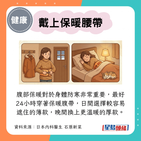 腹部保暖對於身體防寒非常重要,最好24小時穿著保暖腹帶,日間選擇較薄的款式,穿上外套就能遮住,不用擔心「穿崩」,晚間再換上更溫暖的厚款。市面上有不少是功能性材質製成的,可以按需要選擇;皮膚比較容易過敏的人則可以選擇溫和親膚的棉質、絲質等天然材料。