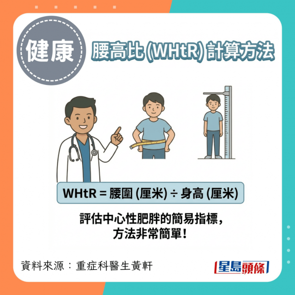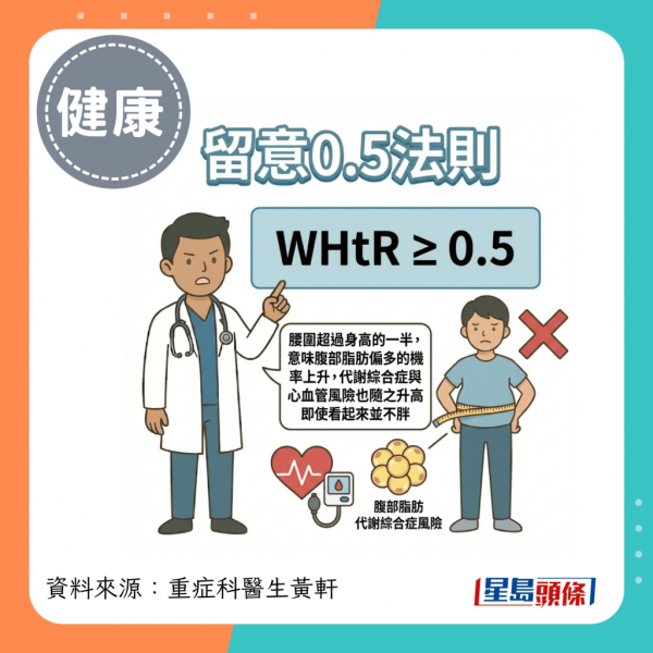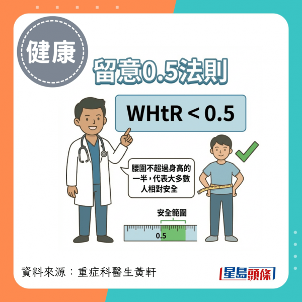 腰高比是評估中心性肥胖的簡易指標,計算方法非常簡單,即「WHtR = 腰圍(厘米) ÷ 身高(厘米)」。黃軒提醒,最簡單的方法是留意「警戒線」0.5法則: