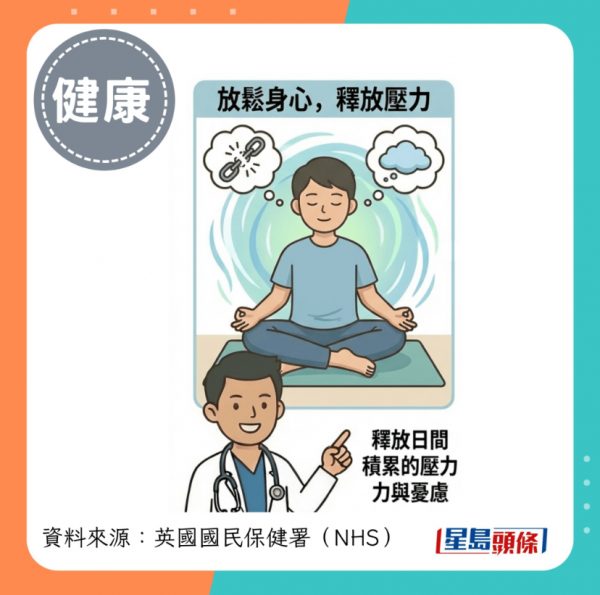 完整過程約需1–2分鐘,建議每晚睡前練習,或在日間感到焦慮時隨時使用。NHS指,冥想及呼吸練習能幫助身體和心靈為睡眠做好準備,且有以下作用: