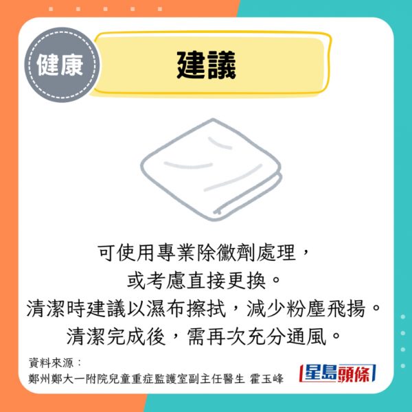可使用專業除黴劑處理,或考慮直接更換。清潔時建議以濕布擦拭,減少粉塵飛揚。清潔完成後,需再次充分通風。