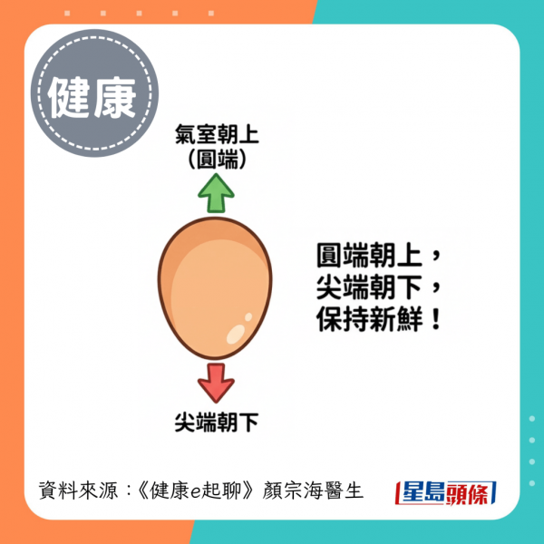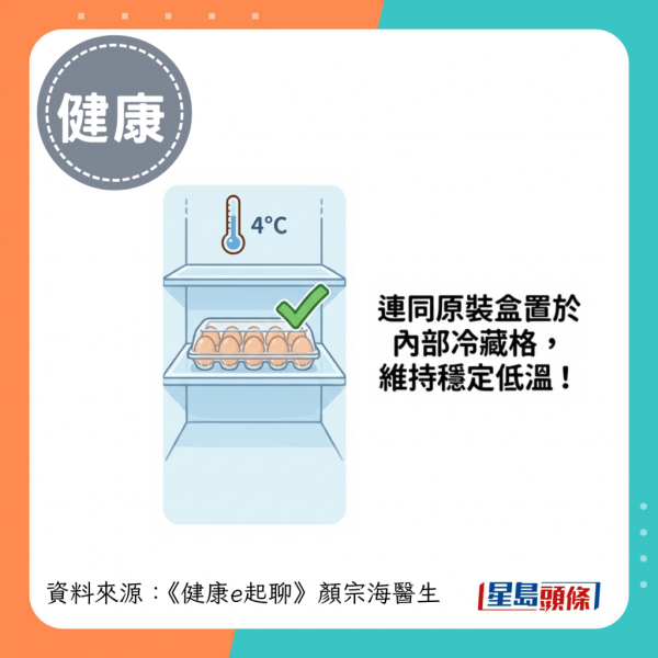 台灣腎臟科醫生顏宗海在節目《健康e起聊》中分享,因為雪櫃門邊是溫度變化最劇烈的區域,每次開關都會影響該處溫度,不利於雞蛋保存。最理想做法是將雞蛋連同原裝透明盒,置於雪櫃內部的冷藏格,以維持穩定低溫。另外,顏醫生指擺放時應注意將雞蛋的圓端(即氣室所在)朝上、尖端朝下,有助保持蛋黃位置居中及減慢水分流失。