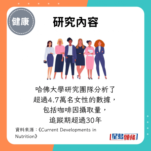 研究團隊分析了《護理師健康研究 (NHS)》中超過4.7萬名女性的健康、生活及飲食習慣數據,包括咖啡因攝取量,追蹤期超過30年。他們將「健康老化」定義為活到70歲或以上、沒有11種主要慢性疾病、身體功能正常、心理健康良好、沒有認知障礙,也沒有記憶力問題。