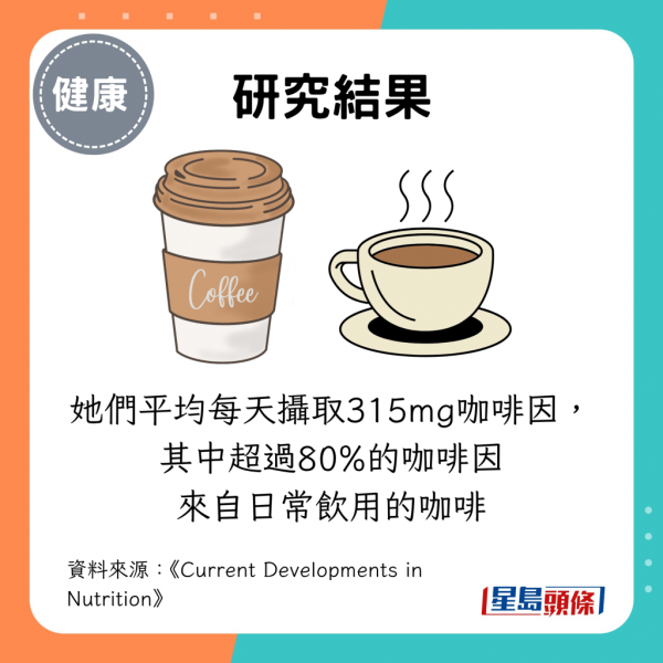 結果顯示,截至2016年,研究中的3,706名女性符合健康老化的所有標準,她們平均每天攝取315mg咖啡因。其中超過80%的咖啡因來自日常飲用的咖啡。