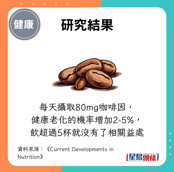 研究人員發現,每天攝取80mg咖啡因(約相當於1小杯咖啡含量),健康老化的機率增加2至5%,這種益處在每天攝取約5小杯咖啡因後開始減弱。即使考慮了其他可能影響健康老化的因素,包括飲食、活動量、體力等,依然呈現出咖啡與健康老化相關的結果。