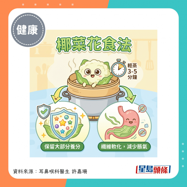 建議以輕蒸3至5分鐘的方式烹調即可,這樣既能保留大部分養分,又能讓纖維軟化,減少腸胃脹氣的機會。