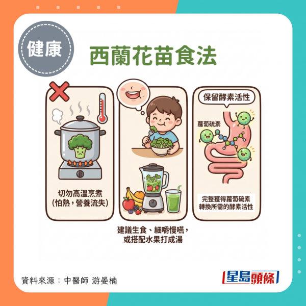 需要注意切勿高溫烹煮,因為西蘭花苗內的營養素怕熱,建議生食、細嚼慢嚥,或搭配水果打成湯,才能完整地獲得蘿蔔硫素轉換所需的酵素活性。