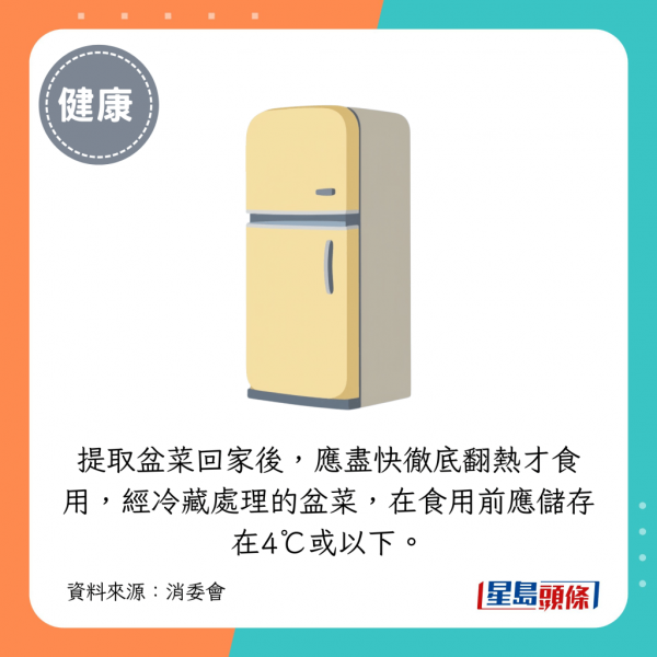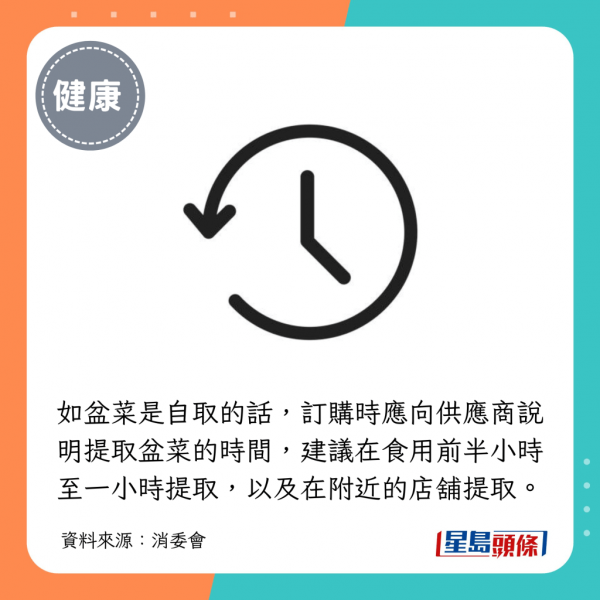 自取盆菜時,應主動向店員查詢正確處理及翻熱盆菜的方法、翻熱所需時間,以及可否使用盛載盆菜的器皿直接翻熱食物。
