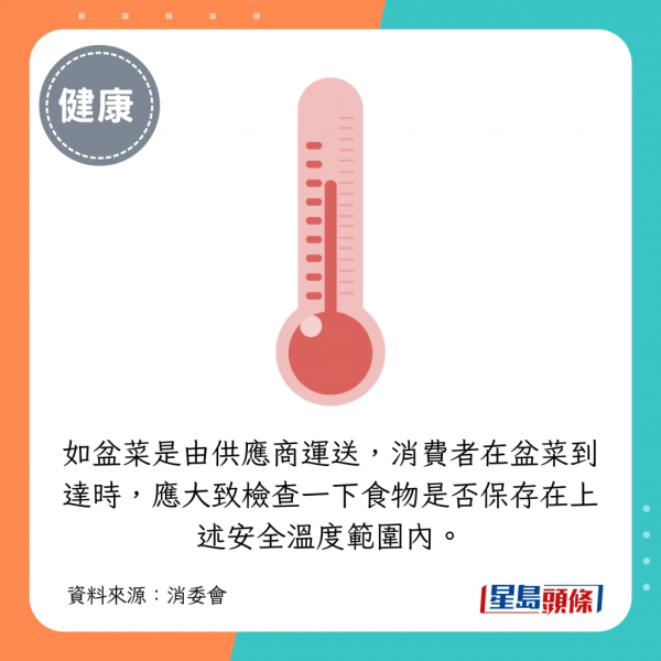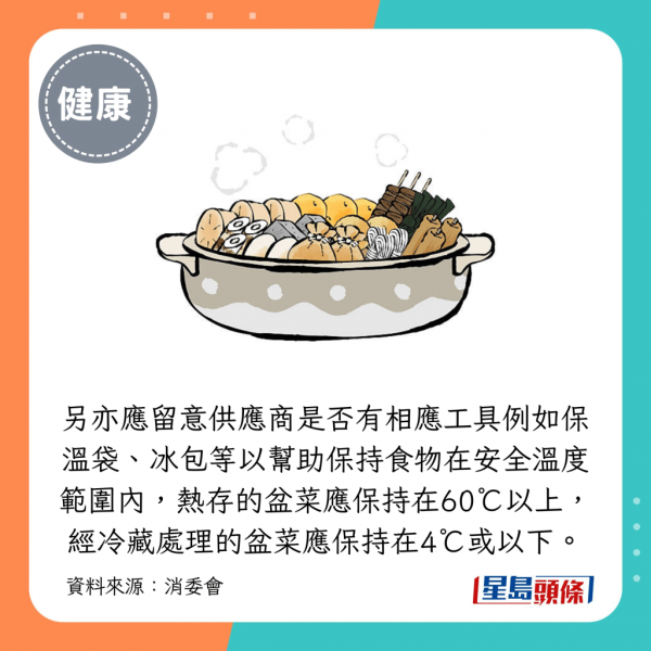 2. 盆菜保溫留意是否有相應工具例如保溫袋、冰包等以幫助保持食物在安全溫度範圍內。自取盆菜後應盡快送到目的地,以避免盆菜放置在危險溫度範圍內超過4小時: