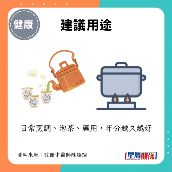 - 用途:日常烹調、泡茶、藥用,年分越久越好。