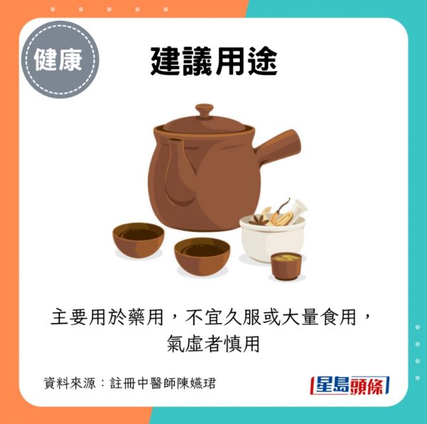 - 用途:主要用於藥用,不宜久服或大量食用,氣虛者慎用。