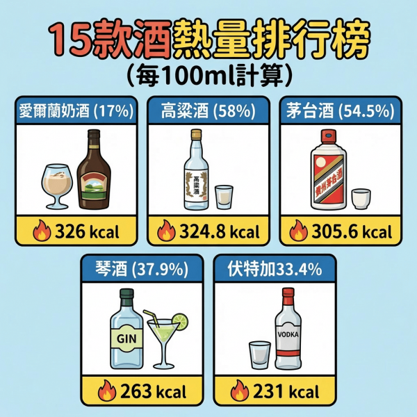 營養師高敏敏在其Facebook 專頁發文表示,不少人誤以為酒精只是液體,其實熱量十分高,不只易醉,更會增大肚腩。她列出15款酒熱量排行榜,大家可作參考: