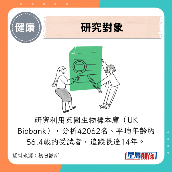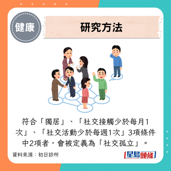 研究利用英國生物樣本庫(UK Biobank),分析42062名、平均年齡約56.4歲的受試者,追蹤長達14年,並將符合「獨居」、「社交接觸少於每月1次」、「參加社交活動少於每周1次」3項條件中2項者,定義為「社交孤立」。