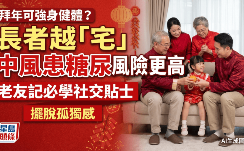 拜年不僅是維繫親戚關係、共聚天倫的活動,原來還是保健強身防病的好方法!有研究指,缺乏社交可致不同慢性病,有醫生更警告,越少出門與人互動的當長輩年紀漸長,飲食再健康也可以會增加糖尿病、心血管病和中風的風險。
