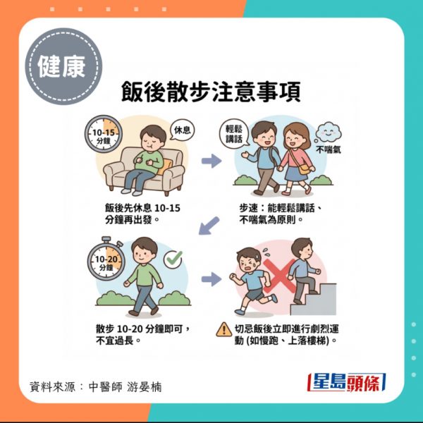 他表示,除了按摩穴位,飯後散步也是消除飽脹感的絕佳方法,有助於消化、減少脹氣、穩定血糖、促進代謝、改善心情與睡眠、以及降低心血管負擔。不過,飯後散步亦有4大事項需要注意: