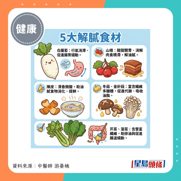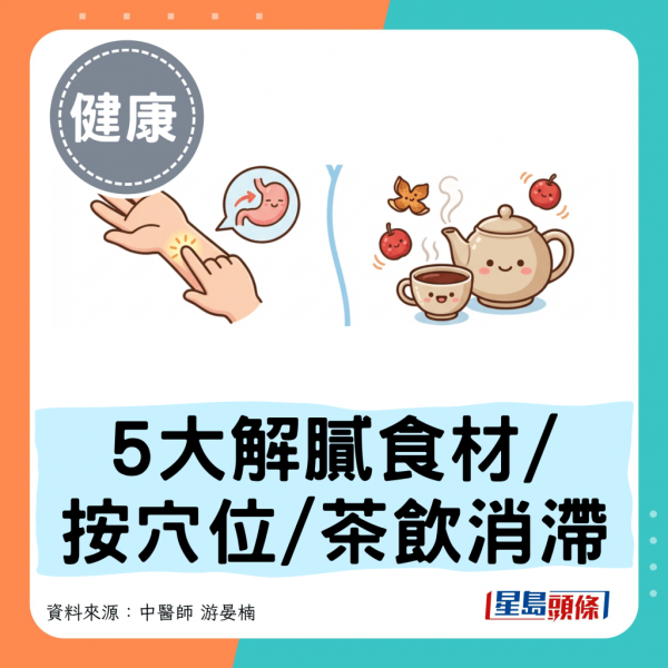 中醫師游晏楠建議,享受年菜時可加入以下5大解膩食材,幫助腸胃減輕負擔。若已出現腹脹,可透過茶飲輔助消化外,亦可以配合簡易穴位按摩和熱敷來改善不適。