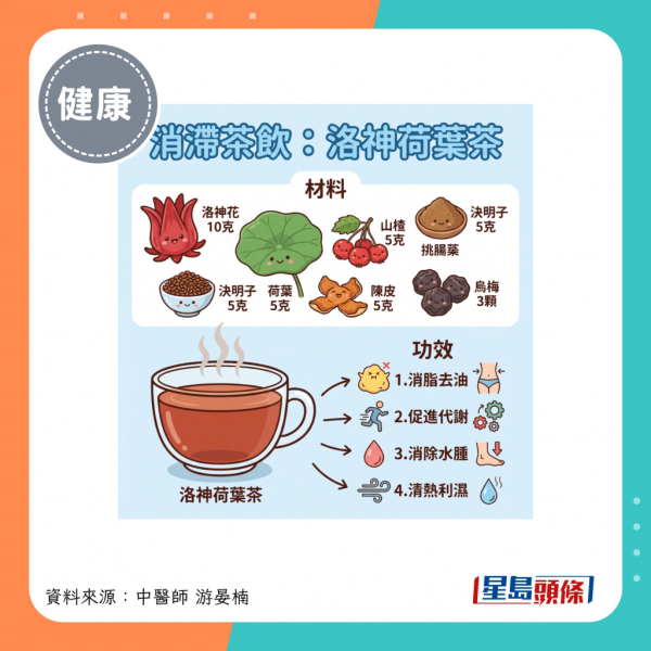 - 以洛神花和荷葉為主要材料,具有消脂去油、促進代謝、消除水腫、清熱利濕等功效。