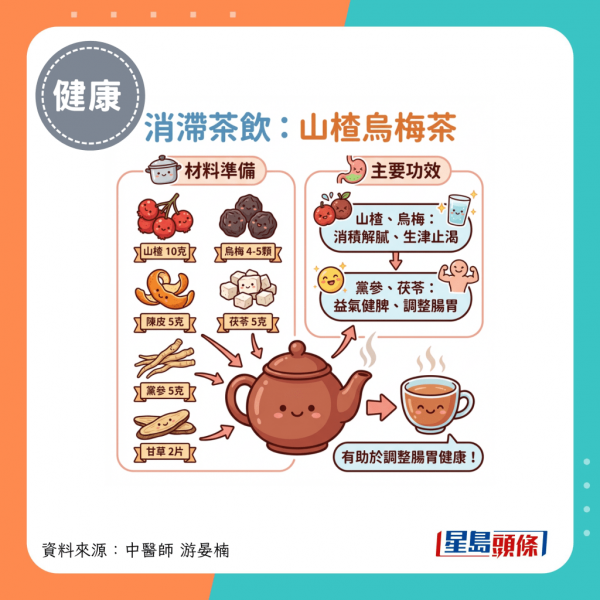 - 材料:山楂10克、烏梅4-5顆、陳皮5克、茯苓5克、黨參5克、甘草2片。