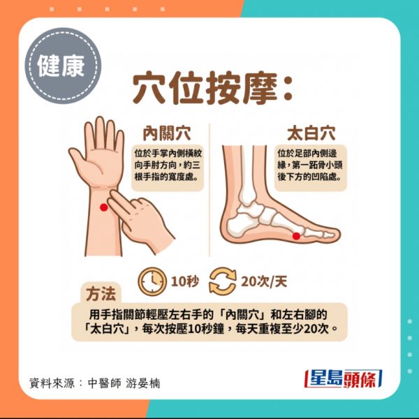用手指關節輕壓左右手的「內關穴」和左右腳的「太白穴」,每次按壓10秒鐘,每天重複至少20次。
