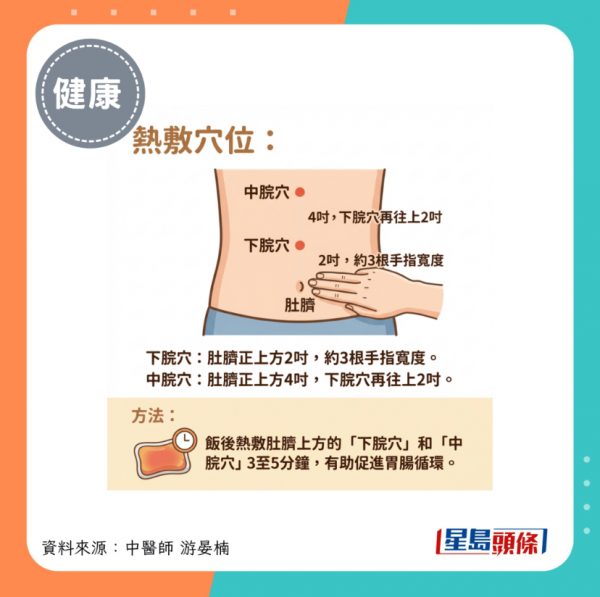 飯後熱敷肚臍上方的「下脘穴」和「中脘穴」3至5分鐘,有助促進胃腸循環。
