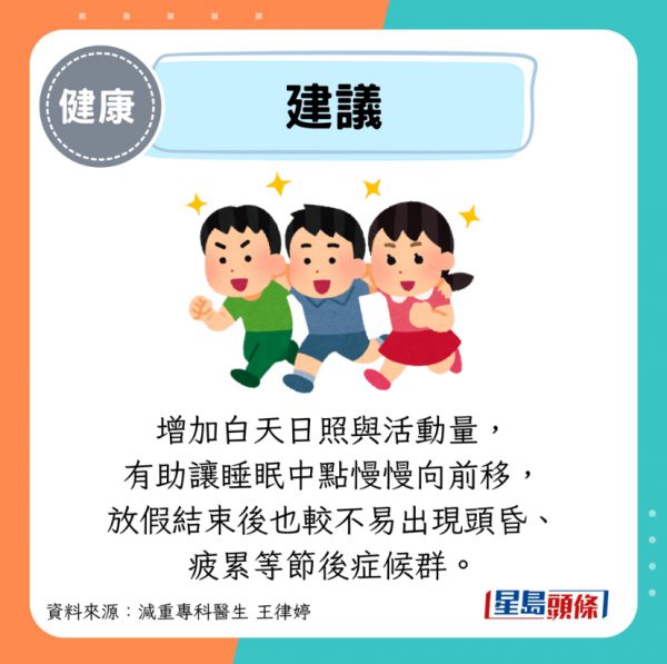 若假期期間已經晚睡晚起,應在假期結束前2到3天開始,每天將起床時間提早20至30分鐘,並同步略微提早入睡,且增加白天日照與活動量,有助讓睡眠中點慢慢向前移,放假結束後也較不易出現頭昏、疲累等節後症候群。