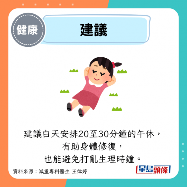 建議白天安排20至30分鐘的午休,有助身體修復,也能避免打亂生理時鐘。