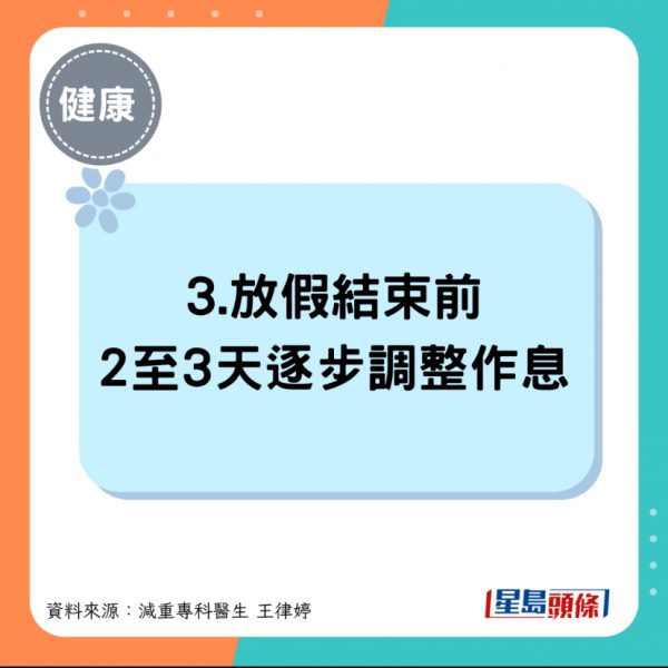 若假期期間已經晚睡晚起,應在假期結束前2到3天開始,每天將起床時間提早20至30分鐘,並同步略微提早入睡,且增加白天日照與活動量,有助讓睡眠中點慢慢向前移,放假結束後也較不易出現頭昏、疲累等節後症候群。