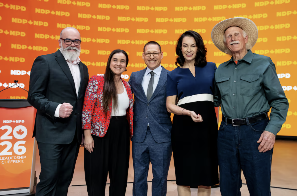 (正在競逐新民主黨黨領的5名候選人,從左至右:Rob Ashton, Tanille Johnston, Avi Lewis, Heather McPherson, Tony McQuail。)