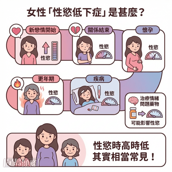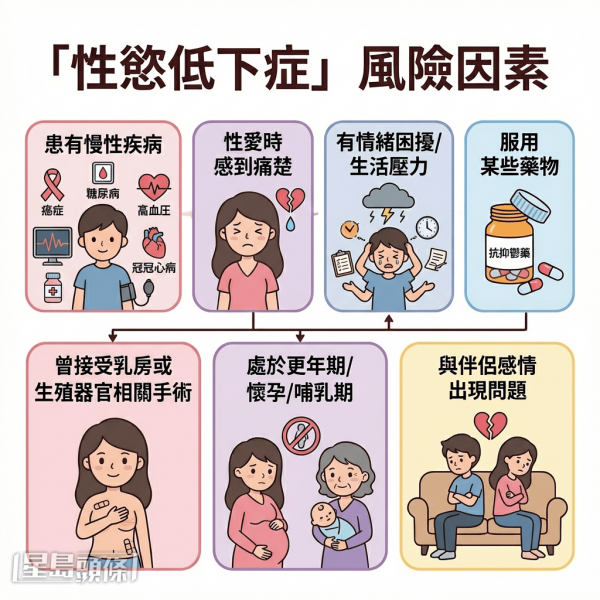 - 懷孕與哺乳期:懷孕期間、產後和哺乳時的荷爾蒙變化,加上疲勞、身體形象轉變、照顧新生兒的壓力,都可能令性慾短暫減退。