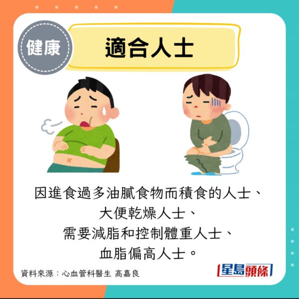 心血管疾病高風險人士、大便乾燥人士、需要減脂和控制體重的人士。