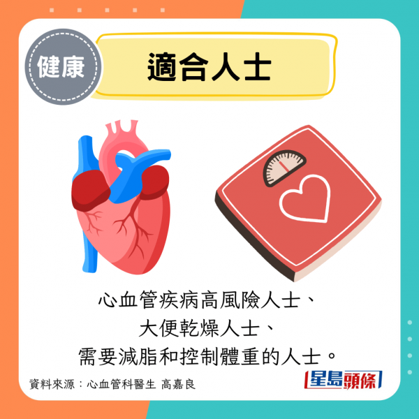 心血管疾病高風險人士、大便乾燥人士、需要減脂和控制體重的人士。