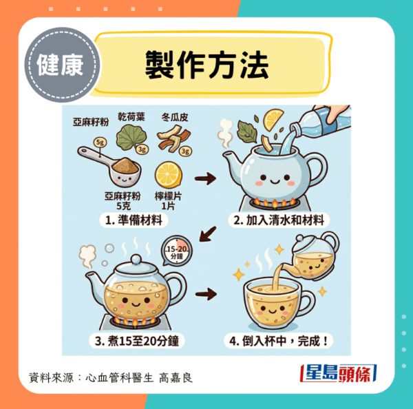 - 取亞麻籽粉5克、乾荷葉3克、冬瓜皮3克、檸檬片1片