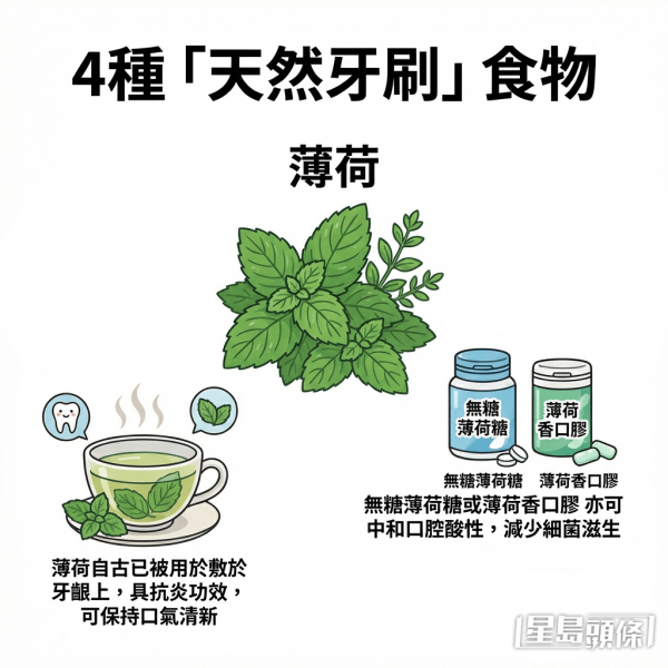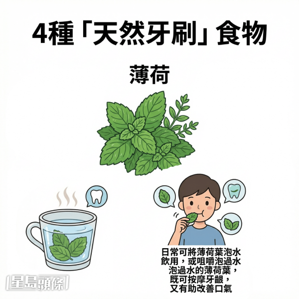 營養師夏子雯在台灣節目《祝你健康》中分享4種食物,因其質地或成分特性,能於嘴嚼過程中發揮清潔牙齦、保持口腔清新的作用,被譽為「天然牙刷」。