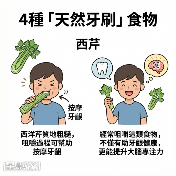 西洋芹質地粗糙,咀嚼過程可幫助按摩牙齦。經常咀嚼這類食物,不僅有助牙齦健康,更能提升大腦專注力。