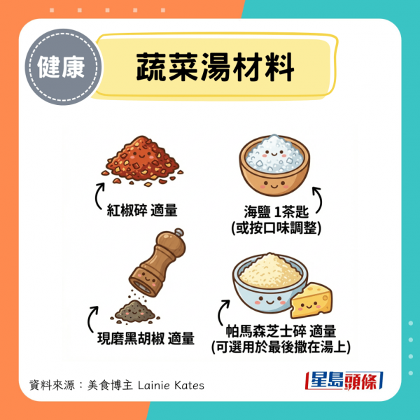 • 帕馬森芝士碎適量(可選用於最後撒在湯上)