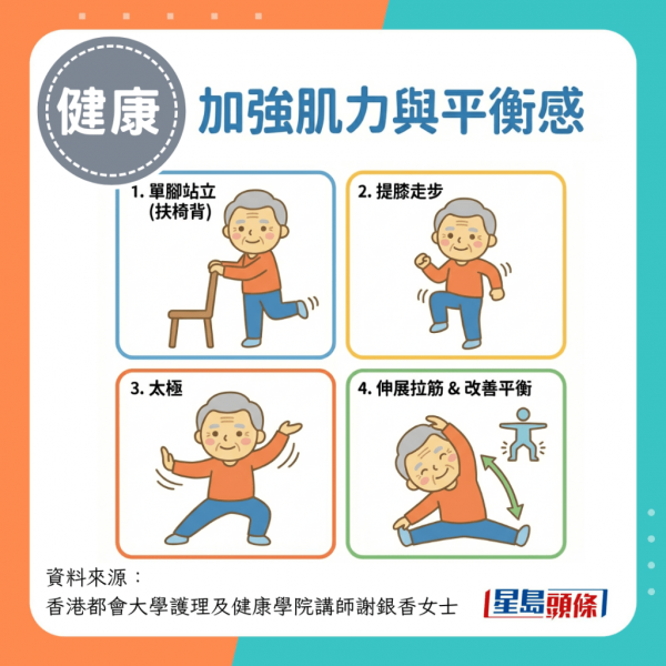 長者每天只需花十分鐘進行單腳站立、提膝走步、太極或伸展拉筋等簡單運動。持續三個月的太極練習可顯著改善平衡與下肢力量。身在家中練習時,也可扶着椅背作支撐。