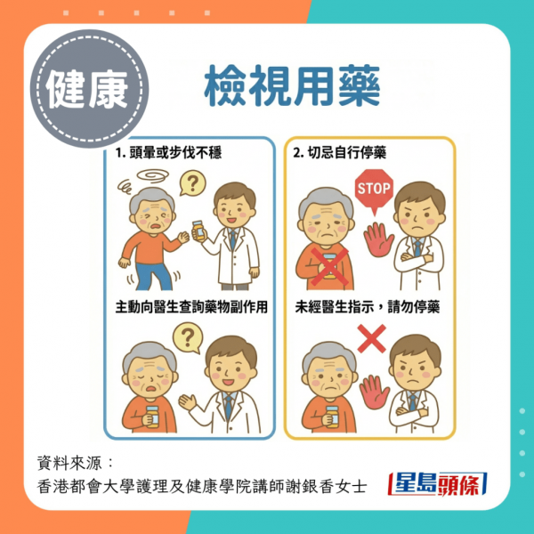 如長者出現頭暈或步伐不穩,應主動向醫生查詢是否與藥物副作用有關,切忌自行停藥。