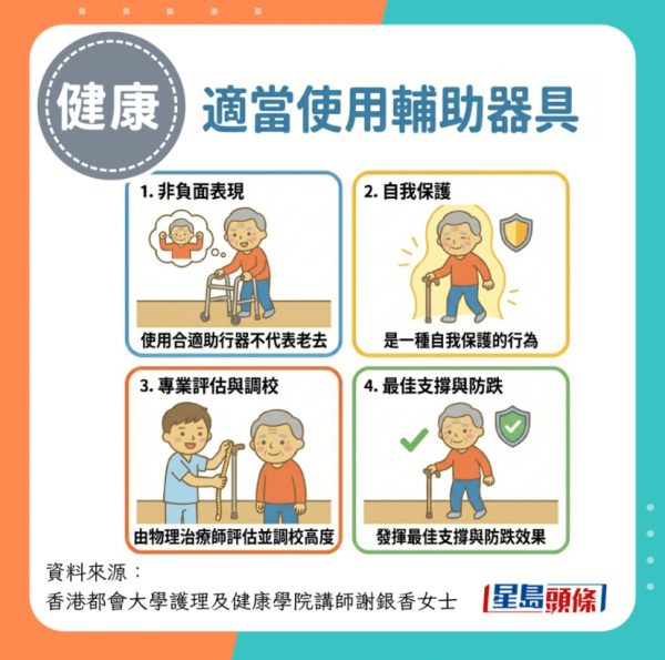 長者使用合適的助行架或拐杖,並不代表「自己老去的負面表現,而是一種自我保護。建議由物理治療師評估與調校輔助器具高度,發揮最佳的支撐與防跌效果。