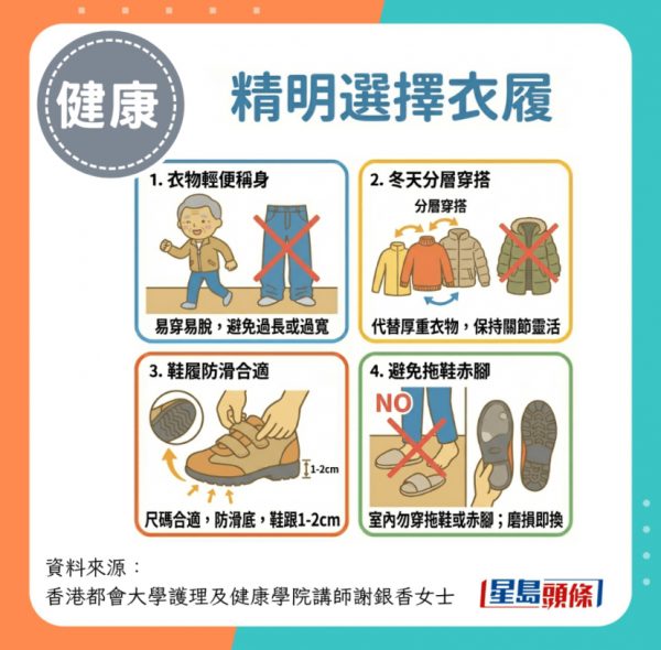 鞋履:應選擇尺碼合適、具防滑底紋及鞋跟約1至2cm的款式(魔術貼或綁緊鞋帶尤佳)。避免穿拖鞋或赤腳於室內行走;若鞋底磨損須即時更換。