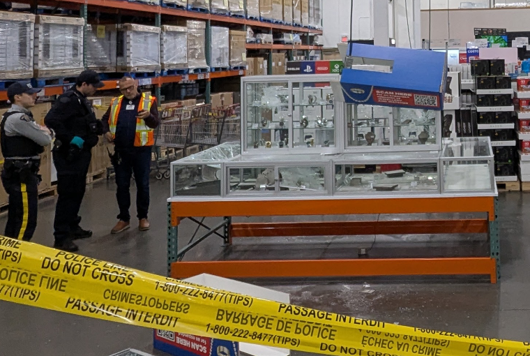 【星島綜合報道】卑詩省高貴林港一家Costco分店,本周稍早疑遭遇搶劫,賊人打破珠寶櫃檯並搶走貨品,現場一片狼藉。