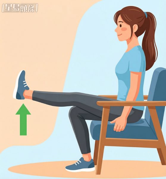 • 坐在椅子上,背部挺直,輪流將雙腿伸直與地面平行,各保持10秒。