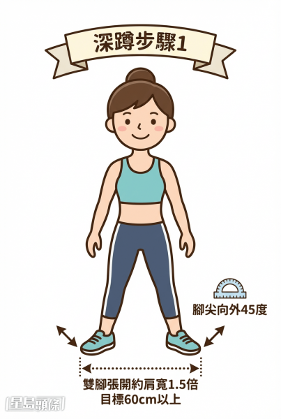 1. 雙腳張開約肩寬1.5倍(目標60cm以上),腳尖向外45度。